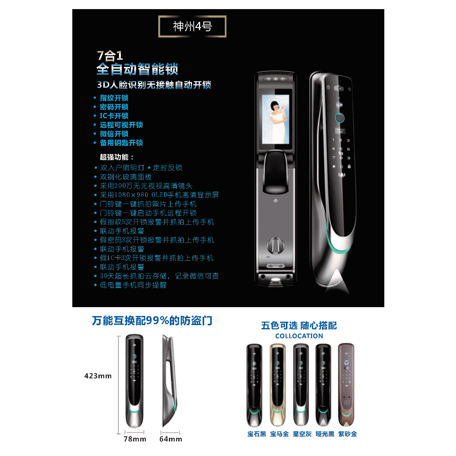 產(chǎn)品描述:神州4號(hào)全自動(dòng)智能鎖,3D人臉識(shí)別無接觸自動(dòng)開鎖,擁有7合1開鎖功能。帶雙入戶照明燈,定時(shí)反鎖,雙鋼化玻璃面板。